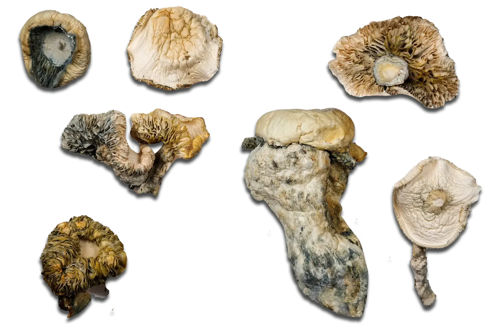 The Cosmic Ghost Rider Magic Mushrooms are easy to recognize due to their unique shape. The stems of the mushrooms are thick and dense, turning a gorgeous deep blue upon being handled, while the medium to large caps are pale white to golden brown. The effects are noted for producing a strong visual and temporal trip, a profound sense of introspection, and sensations of being outside one’s body.